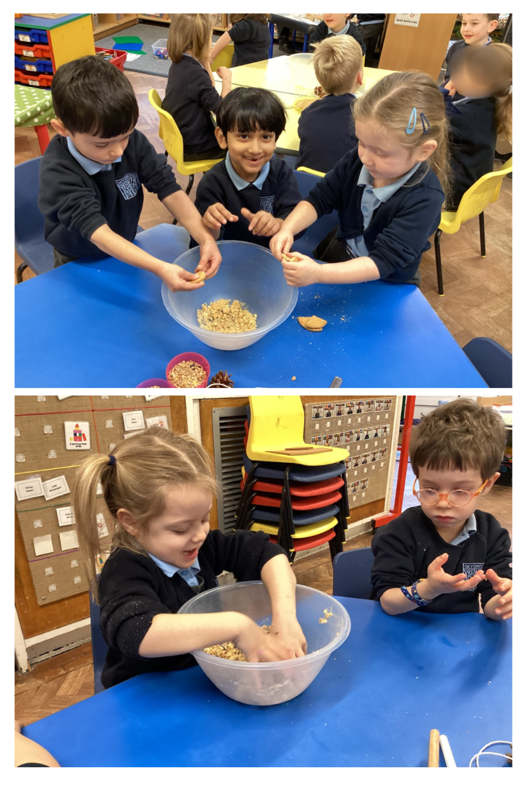 Back inside we got creative making bird feeders to help birds keep warm this winter.